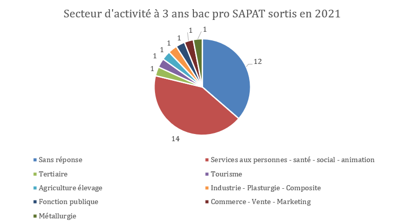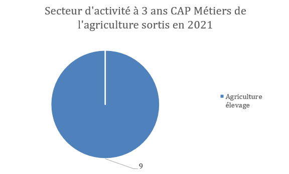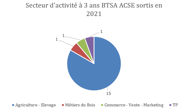 Bac Professionnel SAPAT – Sortants 2021 ![]() Observations principales : Le secteur Services aux personnes, santé, social et animation représente 14 élèves. On note également 12 non-répondants et plusieurs secteurs isolés (tourisme, tertiaire, industrie, agriculture, fonction publique, métallurgie, commerce). Analyse : La diversité des parcours montre une ouverture plus large de ce diplôme. Le taux élevé de non-réponses limite toutefois la précision de l’analyse. CAP Métiers de l’Agriculture – Sortants 2021 ![]() Observations principales : 100 % des 9 élèves travaillent dans l’agriculture/élevage. Analyse : Le CAP mène directement à l’emploi dans son domaine, confirmant son objectif professionnel très ciblé. BTSA ACSE – Sortants 2021