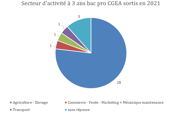 Le Bac Pro SAPAT démontre une bonne insertion globale. INSERTION A 3 ANS DES PROMOTIONS SORTIES EN 2021Enquête réalisée en 2025 sur l'insertion des différentes promotions 2021: Bac Professionnel CGEA – Sortants 2021![]() Observations principales : Le secteur Agriculture – Élevage domine largement avec 20 anciens élèves insérés. Les autres secteurs (commerce, mécanique, transport) ne comptent chacun qu’une personne. Trois élèves n’ont pas répondu. Analyse :